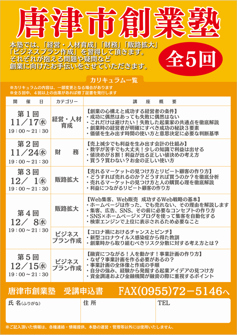 旧唐津市内で創業予定の方は唐津商工会議所(TEL:0955-72-5141)、相知・厳木・浜玉・七山・北波多で創業予定の方は唐津東商工会(TEL:0955-82-3826)、鎮西・呼子・肥前・玄海で創業予定の方は唐津上場商工会(TEL:0955-62-2901)へそれぞれご相談ください。